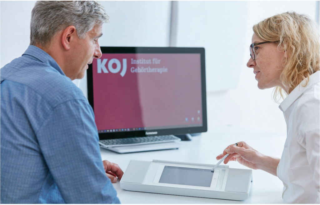 Technologiegestütztes Lernen bietet bereits seit einigen Jahren in vielen Bereichen grosse Vorteile für den Lernenden: Der Lernprozess kann digitalisiert werden, er ist dadurch exakter planbar, feedbackorientiert, adaptiv und vor allem individuell durchführbar. Unser Gehörtraining nutzt diese Prinzipien des digitalen Lernens zum ersten Mal im Bereich der Akustik und Audiologie: Hörgeschädigte Patienten erhalten dadurch die Möglichkeit, die Verarbeitung und Interpretation der stark veränderten und subjektiv verfremdeten Sinneseindrücke bei einer Hörgeräteversorgung gezielt zu trainieren. Dadurch wird ein sonst langjähriger und nicht konsequent durchführbarer Gewöhnungsprozess massiv beschleunigt. In Kombination mit dem therapeutischen Verfahren der Hörgeräteanpassung, Messverfahren und der kompetenten Betreuung entsteht die KOJ-Gehörtherapie. Die Vorteile für einen hörgeschädigten Patienten: