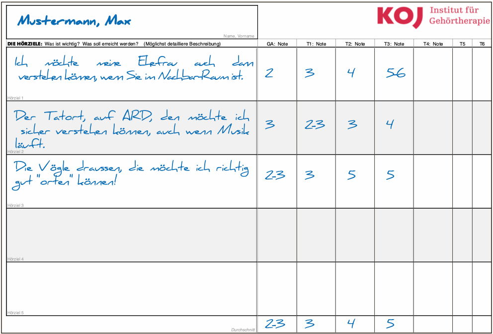 Um dem Patienten nicht nur eine objektive Phonemmessung Messung seiner Fortschritte zu ermöglichen, ist neben der Trainingsauswertung auch die Dokumentation der subjektiven Hörziele von Bedeutung.