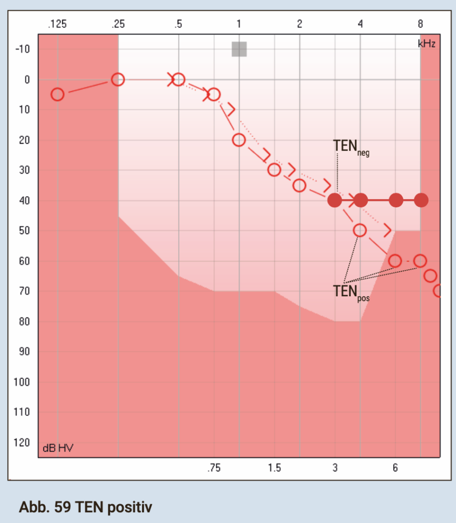 Der TEN-Test ist ein wichtiger Test in Bezug auf die therapeutische Programmierung der Trainingshörsysteme. Durch diese Messung erhalten wir im Hinblick auf die Zielverstärkung Sicherheit und vermeiden mögliche Maskierungen. Die Aussagekraft des TEN-Testes bezieht sich auf das Model der Tuning-Kurven. Ein positives Messergebnis weist auf eine lokale Schädigung der Hörzellen hin (tote Region/death Region).