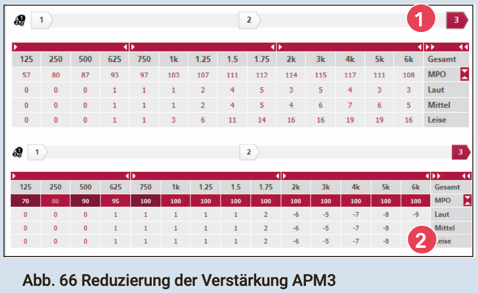 Bei einem positiven Messpunkt wird die Algorith-Zielverstärkung (Anpassmanager Stufe 3) der betreffenden Frequenz reduziert. Diese Reduzierung muss im Laufe der Folgetermine im Auge behalten werden und sollte in Absprache mit dem Patienten erfolgen.