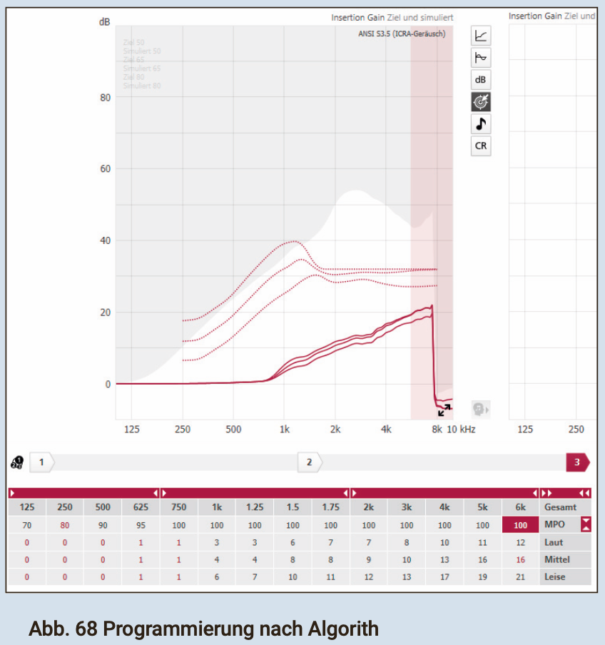 Anhand des Ergebnisses der drei Messwerte der KOJ-Phonem-Messung lässt sich in der Regel abschätzen, wie weit die Deaktivierung der Hörfilter fortgeschritten ist. Eine Messung erfolgt mit drei Messreihen: