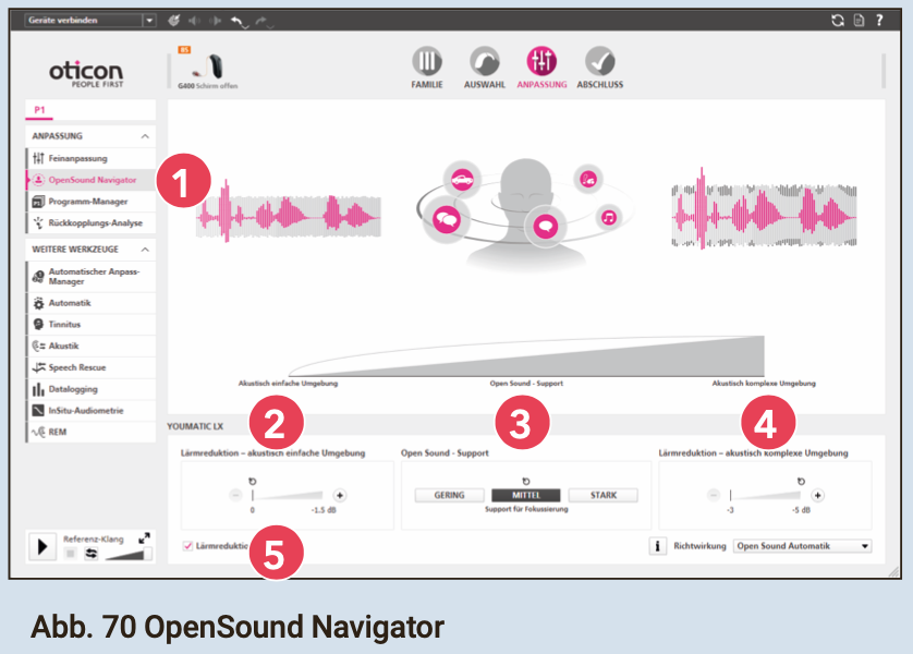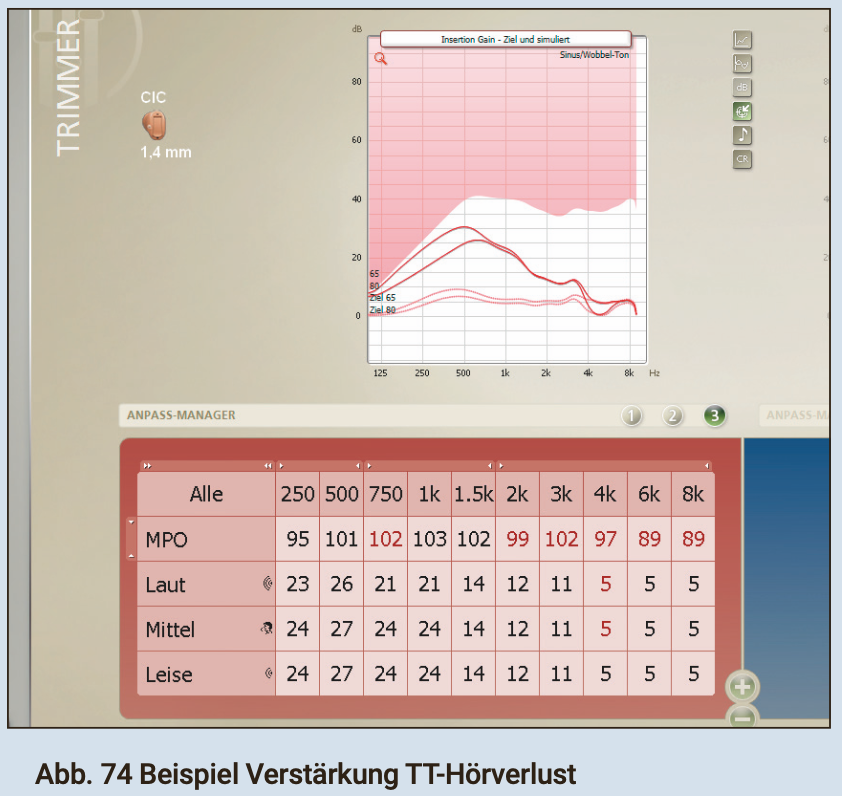 „Gehen Sie im Hauptmenü auf ANPASSUNG, dann sehen Sie sogleich die Anpass-Trimmer. Mit ihnen können Sie die Frequenzbereiche der Hörgeräte feinjustieren. Die Trimmer zeigen Werte für die simulierte Insertion Gain. Deshalb werden die Trimmereinstellungen auch nicht nur durch die benötigte Verstärkung bestimmt, sondern auch durch die errechnete Gehörgangsresonanz und den (Tiefton-) Schallanteil, der aus dem Ohr wieder entweicht. Insbesondere wegen Letzerem ist es so wichtig, dass die Angaben zu Schallschlauch und/oder Vent möglichst präzise sind, da GENIE immer von möglichst weit offenen Versorgungen ausgeht – und man zuviel Tiefton-Verstärkung bekommt, wenn man kleinere als die maximal möglichen Vents verwendet (und dies dem Programm nicht mitteilt)“ [9]
